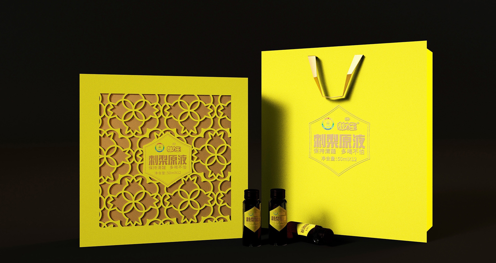 我們對刺力王進行了包裝設(shè)計升級,保留了刺梨元素,并對其進行改良運用,由原有的具象的插畫提取輪廓設(shè)計成紋樣,用剪紙的形式表現(xiàn)在包裝上,簡約不失精致。